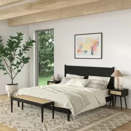 The Angelica Full Bed is a modern full sized bed with a wood headboard and frame. It features a sturdy low-profile platform frame with a high headboard. It has a contemporary splayed and tapered 4-legged base design with plenty of clearance underneath for storing items. It requires no box spring. Your mattress can easily nestle into its nook with extended wood wrap-around edges. This is a bed made for those who want a sleek and modern look in their bedroom design.