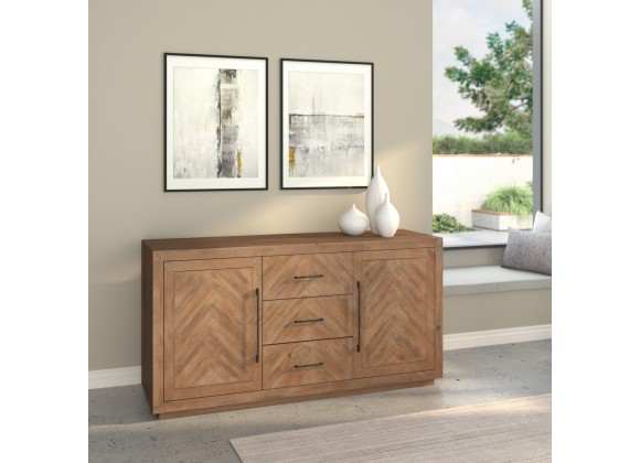 The Aiden sideboard adds a prominent design touch to your dining room. Featuring Pine solids and a Natural Weathered (Brown) finish, this beautiful piece provides function and storage. The front of the sideboard features an inlaid chevron pattern. Brass hardware pulls accent the 2 cabinet doors and 3 drawers. As an individual item, or correlated with the matching dining room, this piece is ideal for any home.