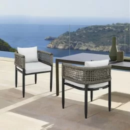 Dine outdoors in style with our Calica patio dining chair. The curved and sheltering back of the chair is upgraded with an elegant weave. Crafted with resilient and weather resistant grey rope, the weave greatly accentuates the visual and tactile feel of our outdoor armchair. This patio chair sits upon slender black steel legs to serve as a sleek and stylish addition.Steel does not dent or get bent out of shape as easily as some aluminum furnishings can. Lighter than wrought iron but heavier than aluminum, steel provides strength, stability, and endurance in extreme temperatures. Featuring a comfy cushion and a boxy seat, our outdoor dining chair effortlessly combines style and comfort, while the zipper closure allows you to remove the cushion covers for easy cleaning! Moisture and water are ongoing concerns for outdoor furniture.Even if your outdoor furniture stays out of the rain, condensation is likely going to build up on the furniture regularly. Polyester is not permeated easily by water. Secondly, polyester resists the types of molds and mildews that will take root in fabrics made of natural fibers. This means the patio furniture will have a longer life with polyester upholstery. Looking fresh in all seasons, our durable outdoor dining chair remains the perfect complement to your patio, backyard, or balcony.This patio chair conveniently ships fully assembled and can be used right after unpackaging. The Calica outdoor dining chair features a grey rope weave, durable black steel legs, and grey upholstery on the cushions.