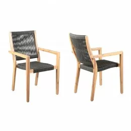 Armen Living Nofi Outdoor Patio Dining Chair in Charcoal Finish with Taupe Cushions and Teak Wood Accent Arms - Set of 2