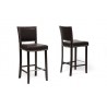 Our Aries Designer Bar Stool looks right at home next to a modern kitchen counter or contemporary bar. Bring this beauty home and you will enjoy sleek black faux leather, a wenge solid rubber wood frame, convenient stainless steel foot rest, and non-marking feet. Additional support comes from steel L-brackets on the crossbars. Foam cushioning with iron springs offer ample support and comfort. Silver nail head trim completes this Malaysian-made contemporary bar chair. To clean, wipe with a damp cloth. We offer the Aries Stool, which requires assembly (rubber mallet required), in a set of two.