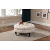 With sumptuous button tufting and black turned wood legs, the Palfrey Upholstered Ottoman instantly augments the elegance of your interior. This stunning modern ottoman is made in China with durable eucalyptus wood for its frame, firm foam cushioning, and beige linen upholstery with a fanciful French script print. Antiqued brass upholstery tacks line the sides. The Palfrey Round Ottoman requires minor assembly and should be spot cleaned as needed.