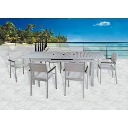 Bellini Home and Garden Galliano 9 Pc Dining Set with Sling in Neptum Fabric is made for those who often spend ample time relaxing and lounging. Relax and enjoy while dining in comfort and style. A grey frame and Neptum Blue sling seat combined with our teak table top, the Galliano dining set is unique in design offering both visual impact and exceptional comfort. The sleek, powder-coated frame is made of 100% aluminum, making it both strong and substantial while remaining lightweight. The finish and streamlined design work well with a variety of outdoor décor. The premium-quality mesh sling is supportive yet giving and allows air to circulate to keep you cool. Resilient and quick-drying mesh sling contributes to the sleek design.