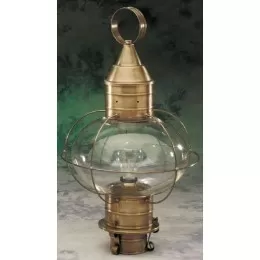 This 632 Small Hanging Onion Light fixture by Brass Traditions got you covered with six finish options available. This traditionally-styled flush mount ceiling fixture brings about that Old New English feel to your homes. The great colonial look features a faux-hitch ring handcrafted brass and hand blown glass elements.