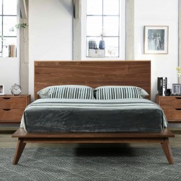 Blending solid and engineered wood with beautiful walnut and oak veneers, this bed offers quality construction and a stand-out look with all the warmth and comfort that is conducive for an inviting slumber. The slightly padded headboard is upholstered in a linen-like fabric that perfectly offsets the richness of the wood. With its low profile design, this bed sits directly atop slats for a clean, modern look that works with a variety of design styles.