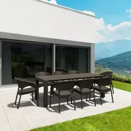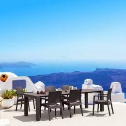 Compamia Ibiza 5-Piece Outdoor Dining Set is composed of one 31 inch square table and four Florida chairs. Table has HPL compact laminated top with the latest generation of air moulding thermoplastic legs that looks like woven wicker. This table and chair set is made outdoor use but suitable for indoors as well.