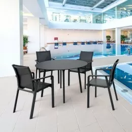 High quality commercial grade resin furniture - featuring refined designs, that are weatherproof, comfortable, and functional. Preferred for heavy use areas, pool sides, patios, beach and balcony use. Items are resistant to UV, salt, weather, sun tanning oils. Pacific resort quality dining set with ten sling arm chairs and an extension table. Simple sleek design with commercial strength. Sling is made with Serge Ferrari mesh fabric. Chair is very comfortable and no need for cushions. Stacks for easy storage. Frame made of marine grade resin polypropylene. Extremely durable and comfortable. Commercial grade.