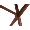 The Eslov dining table has a rectangular table top made with an ash hardwood veneer stained in medium walnut stain over an MDF core. Supporting the table top are solid ash “scissor” legs in a matching stain.