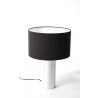 The Willis table lamp has a base column of brushed aluminum with its light surrounded by a circular black fabric shade of much large diameter. Two similar geometric shapes combine to provide light from one E27 100W bulb (not included).