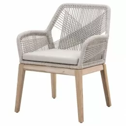 This woven arm chair will add a touch of coastal style to your kitchen or dining space. Constructed with solid mahogany legs, this dining chair is not only sturdy, but durable. White rattan is tightly woven to create a unique design, while the wood legs and arms have a beautiful distressed Natural Gray finish. Paired with a removable Light Gray seat cushion, the chair provides comfort with style and will be the perfect addition to any transitional or traditional dining room.
