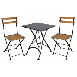 This folding dining set by Furniture Designhouse has been designed and hand-forged in Europe by 'old world' artisans, using the finest materials and built to last a lifetime. From the hand-crafted steel frames and wood seating and dining surfaces, to the standard architectural finish that is UV, Scratch and Salt-spray resistant… this lovely French Café bistro furniture is second to none and backed by an industry leading three-year warranty! Table top is an ultra durable solid metal surface. Chair slats are European Chestnut with a Walnut stain.