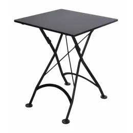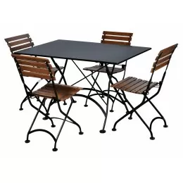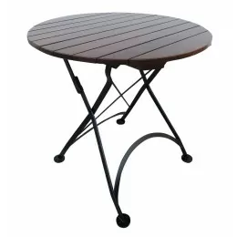 This folding dining set by Furniture Designhouse has been designed and hand-forged in Europe by 'old world' artisans, using the finest materials and built to last a lifetime. From the hand-crafted steel frames and wood seating and dining surfaces, to the standard architectural finish that is UV, Scratch and Salt-spray resistant… this lovely French Café bistro furniture is second to none and backed by an industry leading three-year warranty! Table top is an ultra durable solid metal surface. Chair slats are African Teak.
