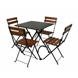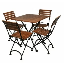 This folding dining set by Furniture Designhouse has been designed and hand-forged in Europe by 'old world' artisans, using the finest materials and built to last a lifetime. From the hand-crafted steel frames and wood seating and dining surfaces, to the standard architectural finish that is UV, Scratch and Salt-spray resistant… this lovely French Café bistro furniture is second to none and backed by an industry leading three-year warranty! Table top and chair slats are African Teak.