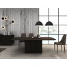 Clean lines and a luxurious wood finish is what distinguishes the Moderna Dining Set collection. The collection is designed with a beautiful dark oak veneer to highlight the clean lines featured prominently in the design. The dining table's pedestal base also displays the beautiful vertical line aesthetic. The buffet's four large doors with horizontal interior shelving also provide plenty of storage for all of your house hold dining needs. The dining chairs emphasize comfort and style over everything, upholstered with a beautiful dark grey colored leatherette. The subtleness of the design allows this versatile set to easily blend in with most modern interiors.