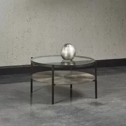 This round end table will evoke luxury and drama into any space. Features a glass top and an exquisite bronzed gunmetal shelf with a starburst pattern. A tubular black metal … Read More