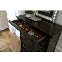 With its bold traditional style and impressive storage capacity, this master chest is both a statement piece and a functional essential. Featuring fifteen smooth-gliding drawers at the center, it provides ample space for everything from socks to sweaters. Cleverly concealed at the top, two hidden felt-lined drawers—accessed via discreet metal tabs—offer a secure spot for valuables like jewelry and wristwatches. Bar-style pulls add a subtle metallic accent, while the well-defined framing on the drawer fronts evokes the elegance of museum-quality storage. Resting on sturdy bracket feet, this tall and grand chest is the perfect centerpiece for a refined bedroom ensemble.