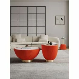 • Manhattan Comfort Modern Anderson Coffee Table and End Table 1.0 Upholstered in Leatherette with Ceramic Faux Tabletop and Gold Metal Tabletop- Set of 2 Orange