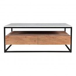A sleek contemporary style, constructed with an iron frame and solid acacia with a light brown stain.