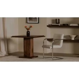 The May cafe table's unique double square top and rectangular post leg create an intriguing visual harmony. Crafted from rich walnut, the table exudes warmth and natural beauty. Subtle curves and angled edges offer ergonomic comfort, inviting lingering moments, effortlessly transitioning from cafe table to entryway accent.