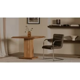 • Double square top with rectangular post leg & square base Solid oak construction Slightly rounded with curved tabletop at a slight angle for a soft