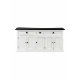 Add this buffet, full of modern charm, to your living room or dining room. It features ample storage and Antique Brass hardware, and its kiln-dried solid mahogany frame wears a Classic White finish. It is perfect to complement just about any other finish in the room. Inside, six internal shelves help you keep everything from dishes to linens organized with ease, while the four drawers on top are great for grab-and-go selections.