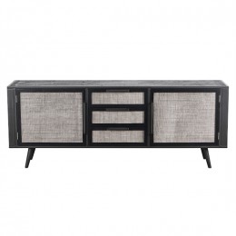 Nordic Mindi Rattan successfully fuses the sleek and minimalistic simplicity that Scandinavian furniture is most recognized for with the textured pallet of Mindi hardwood and renewed boat wood. The powder coated iron steel frame and hardware adds a contemporary look and feel to your home. All items are finished with a black water-based paint that lightly reveals the rustic texture of the underlying wood. Handwoven split rattan door and drawer fronts add a natural and unstructured look to each piece. Each piece in the collection is handcrafted and one of a kind.