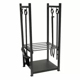 With its traditional styling, our Mr. Bar-B-Q UniFlame® Black Wrought Iron Log Holder with Leather Carrier is more than practical. Load up this sturdy leather carrier at the wood pile and carry it in. The handles of the leather carrier are designed to hang from the log holder, making it a convenient and attractive way to store your fireplace wood.