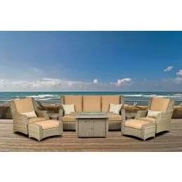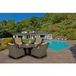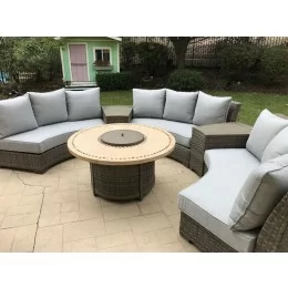 The Patio Resort Lifestyles Bermuda 6-Piece Circular Sofa Set is all you need to make that garden or patio setup light up and have that relaxing vibe with comfort and style right at home. This modern garden/patio set includes Sunbrella® Canvas cushions that comes with 3 circular sofas along with 2 circular accent tables and a 48" travertine fire table w/ glass and burner.