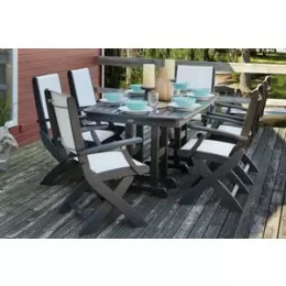 Whether your outdoor dining area is on land or sea, you’re sure to create a unique look with the marine-inspired POLYWOOD® Nautical 7-Piece Dining Set. This striking set includes six Nautical Highback Chairs with signature headboards that not only offer outstanding comfort and back support, but they also fold flat for easy transportation and storage. In addition, the set comes with a spacious Nautical 37” x 72” Dining Table that’s perfect for large gatherings. This set is constructed of solid POLYWOOD® recycled lumber and available in three fade-resistant color choices so you can count on its good looks and durability for many years to come.