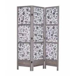 The Screen Gems Hampton Screen features 3 panel floor screen. It has a solid wood frame and stained in a rubber soft grey finish. Its detailed scroll work and leaf designs in the center of each panel are made from antique brass metal finish.