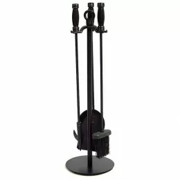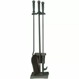 This rustic Mr. Bar-B-Q UniFlame® 5 Piece Black Rustic Mini Fireset with Crook Handles has all the tools you need to tend to a roaring fire. The set Includes a stand, poker, brush, log lifter and shovel. Its popular black wrought iron finish and classic styling will accent a variety of décor. Tools hang from integrated hook handles that are both attractive and functional.