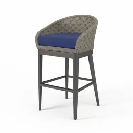 The Milano Barstool epitomizes sleek design and meticulous craftsmanship; boasting clean lines and thoughtfully angled features. Its rust-resistant aluminum frame is meticulously hand-wrapped with premium all-weather olefin rope in a sophisticated charcoal-grey hue culminating in a slate tapered leg. Milano is part of the Slate color palette harmonizing seamlessly with Redondo; Granite occasional and fire tables and other selections from the Bazaar collection.