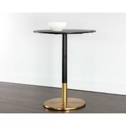 An Art Deco inspired round bar table, featuring a solid carrara marble top with an antique gold steel base. Perfect for bars, lounges and restaurants. As marble is a natural material, unique veining, pitting, fissures, micro-cracks and colour variations are all characteristics that add to the uniqueness and beauty of each piece.