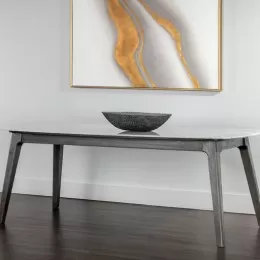 A sculpted media console and cabinet with a sleek modern appeal. Features a white marble top paired with a sturdy acacia wood base in a brushed grey finish. Completed with … Read More