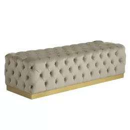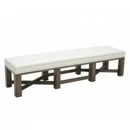 Resemblant of the medieval era, this impressive bench measures 76" long with a bold distressed frame. Double row nailhead detailing completes this look. Stocked in overcast grey faux leather.