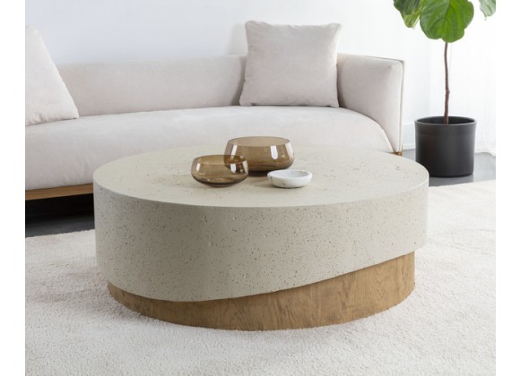 The Patras Coffee Table's stunning sculptural form makes it the ideal centrepiece for any space. Fully constructed from concrete, this table features a textured high-low top that embraces a round base cleverly designed to resemble rustic oak wood.
