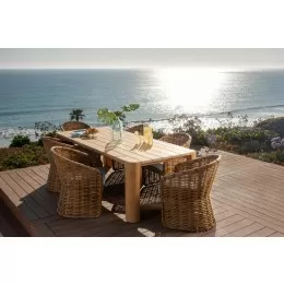 Sunset West's Natural Teak Dining Table is expertly crafted from 100% solid teak wood, offering both durability and timeless appeal. Over time, the wood develops a rich patina, while its natural grooves ensure that each piece is uniquely distinctive. Renowned for its strength and moisture-resistant oils, teak wood makes this dining table an ideal choice for outdoor living, blending style with long-lasting performance.
