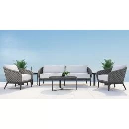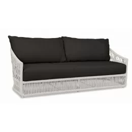 Constructed with a fully welded, scratch-resistant powder-coated aluminum frame finished in Graphite, the Pietra Sofa is enveloped in weather-resistant Stone grey rope that retains its colorfastness. It boasts weather-resistant, high-resiliency foam cushions for enduring comfort. Stocked with Premium Sunbrella fabric in Echo Ash, this sofa also features non-marking plastic glides and is crafted to commercial quality standards. Custom cushion options are available in approximately four weeks.