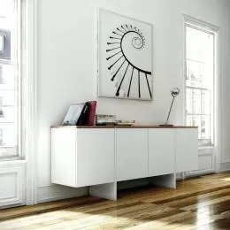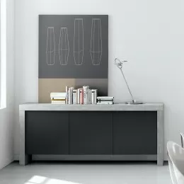 Join is a modular system of sideboards designed with focused lines for multifunctional spaces. Join is the perfect fitting for a hallway, living, dining or home office interior, and illustrates perfectly the famous quote from Leonardo Da Vinci: “Simplicity is the ultimate sophistication”. This complete system is available in five different sizes – 60, 120, 160, 180 and 200 cm, with two possible heights for the sideboard’s body, six diverse finishes for the top - between wood veneer, marble and glass – and two feet options, since you can opt for a more conventional base or a black metallic structure.