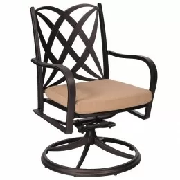 Introducing the Woodard Belden Padded Sling High Back Swivel Rocker, where classic outdoor sophistication meets modern performance in a luxurious and versatile design. Crafted with durability and elegance in mind, this padded sling swivel rocker features a high back for extra support, providing enhanced comfort for taller individuals. The chair also boasts a motion base that allows for gentle rocking and side-to-side movement, elevating your outdoor relaxation experience. With its fast-drying padded sling covering that is tough, weather-resistant, and extra comfortable, and its aluminum frame adorned with hand-forged details such as regal arm scrolls and a uniquely ornate back emblem, this swivel rocker adds a touch of timeless charm to any outdoor dining space.