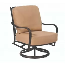 Elevate your outdoor dining experience with the Woodard Belden Padded Sling High Back Swivel Rocker, where every detail is crafted to provide both comfort and enduring elegance.