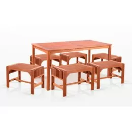 Have you encountered the wonder of the backless bench yet? It's got all the good qualities of a regular bench, except with five times the versatility. When you've got a full dining set composed of premium outdoor furniture (and yes, a collection of backless benches), your back yard better watch out. Made from premium-grade tightly grained Eucalyptus hardwood (similar to, but more durable than Teak), this dining set can withstand weather, dampness, insects, and decay, as well as the general wear and tear it will encounter from day to day use. So go ahead, go backless.