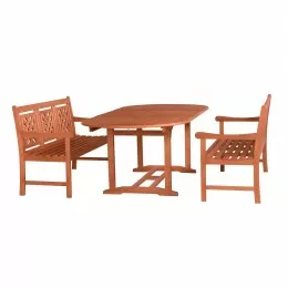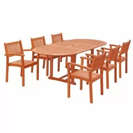 Transform your backyard into a relaxing outdoor space for family and friends on a summer evening and share your stories! With 100% Eucalyptus solid wood construction which is pre-treated and expertly kiln-dried, this rustic style patio dining set is suitable for both indoor and outdoor use. It quickly repels water, and its natural oil combats and repels wood eating insects. The combination of slatted and contoured seat design with beautiful natural wood finish delivers extra comfort in both touch and postures.