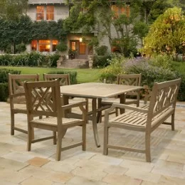 Enjoy dinner with family and friends right in your backyard on a summer evening and share the your stories! With 100% Acacia solid wood construction which is pre-treated and expertly kiln-dried, this vintage style patio dining set is suitable for both indoor and outdoor use. It quickly repels water, and its natural oil combats and repels wood eating insects. The combination of slatted and contoured seat design delivers extra comfort in both touch and postures. The extendable length of 67"-91" offers more seats when needed. Its Vista Grey Hand-scraped Hardwood Finish offers a natural vintage look for any front porch, deck, backyard, patio, garden, or any outdoor space.