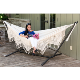 • Double Cotton Hammock with Solid Pine Arc Stand (Natural with Fringe)