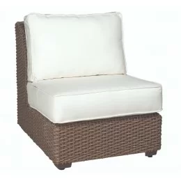 Introducing the Woodard Cooper Armless Sectional Unit, a versatile and transitional piece that smoothly fits between any combination of outdoor furniture pieces you choose. Part of the relaxing Cooper Collection from the skillful furniture makers at Woodard, this armless patio chair is crafted using long-lasting, fade-resistant HDPE (high-density polyethylene) woven wicker infused with UV inhibitors. The beautiful, traditional wicker weave in rich Amazon brown is perfectly accented by comfy foam cushions wrapped in outdoor fabric custom-made to match your personal style of home decor. Sit back and relax in the inviting Cooper Armless Sectional Unit.