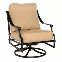 The Woodard Derby Swivel Rocking Lounge Chair, featuring lattice pattern arms and bold curves, is an ideal addition to any patio paradise. This lounge chair offers all-day comfort with full cushions and a motion base that allows for gentle side-to-side and back-and-forth motion. Enhance your outdoor seating area by pairing it with a matching Derby loveseat, sofa, or ottoman. The Derby collection is designed for lasting outdoor comfort with durable wrought iron frames, and Woodard's finishing process helps prevent fading, corroding, and rusting, ensuring season after season of unmatched elegance.